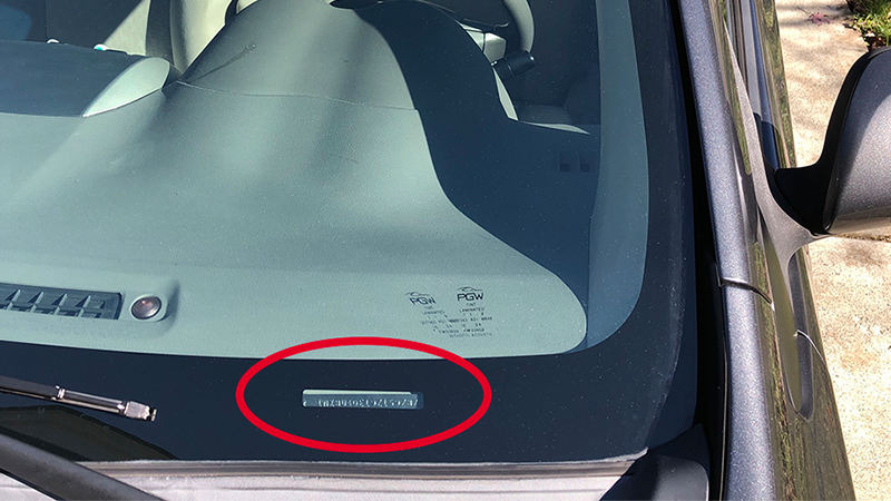 Some older vehicles may not have these labels anymore if a collision required body panel replacement. Others may technically have a label, but over time they've become illegible. In cases like these, you can move to the lower driver's side corner of the windshield. Standing outside the vehicle next to the driver's side mirror, you can look down and find the VIN in the bottom corner of the dash where it meets the windshield.