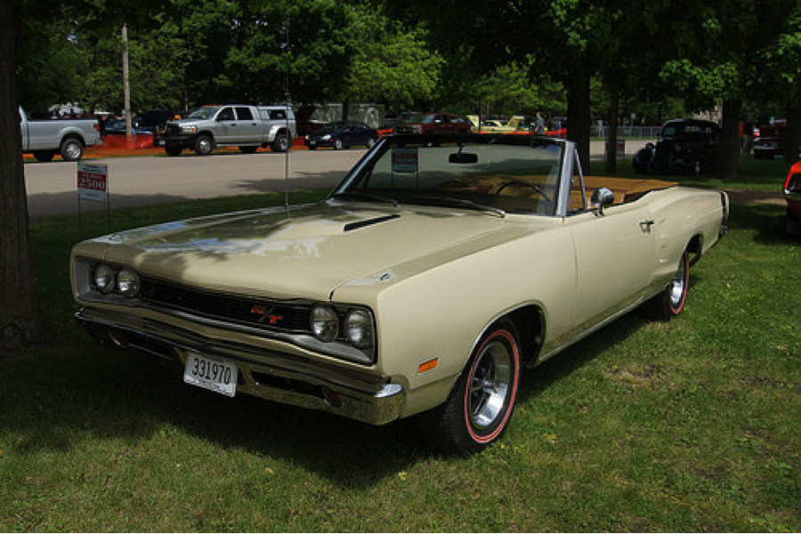 The 1969 Dodge Coronet R/T was a mid-size powerhouse made between 1967 and 1970. While the less-expensive Super Bee version came with a 383 c.i. V8 under the hood, the R/T model came standard with a massive 440 c.i. Magnum V8 engine. The 440 Magnum was rated at an impressive 375 hp and came attached to a three-speed TorqueFlite automatic or a four-speed manual gearbox. Even more power was available via the 440 "Six Pack" (featured triple two-barrel carburetion) and 426 Hemi engine options, which made 390- and 425-horsepower, respectively.