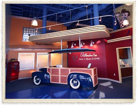 When orthodontist Dr. David J. Myers from Conway, Arkansas was looking for new office space, he was tempted to locate in a building that had served as a gas station since the 1940s and was being revamped. Although that didn’t work out, he and his staff did decide to go with the car motif in his new office, with: