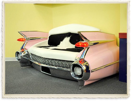 - the front desk built out of the front end and fenders of a wood-grained 1947 Mercury