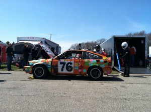 Team Gutty’s orange Honda CRX at Gingerman Raceway in April 2013 pauses for a routine fuel and driver stop. This team won Class B at the race and finished sixth overall. Back to Mike. As he shares in a blog post, here is how he became involved in LeMons: the owner of the racing team attended an event in 2012; he was so impressed that he headed out to find a “$450 BMW 325e with 266,000 miles on the odometer. It was ugly, rusty, and smelled funny. So essentially it was the perfect car to compete in such an event. A true hunk ‘o junk.”